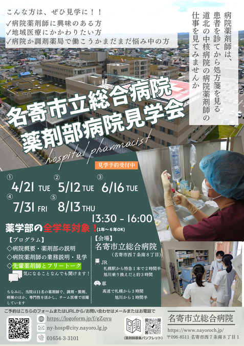 4月~8月は月1回日にちを設定して、薬剤部見学会を開催しますので、興味あればぜひご参加ください。(詳細はポスターをご確認ください)
