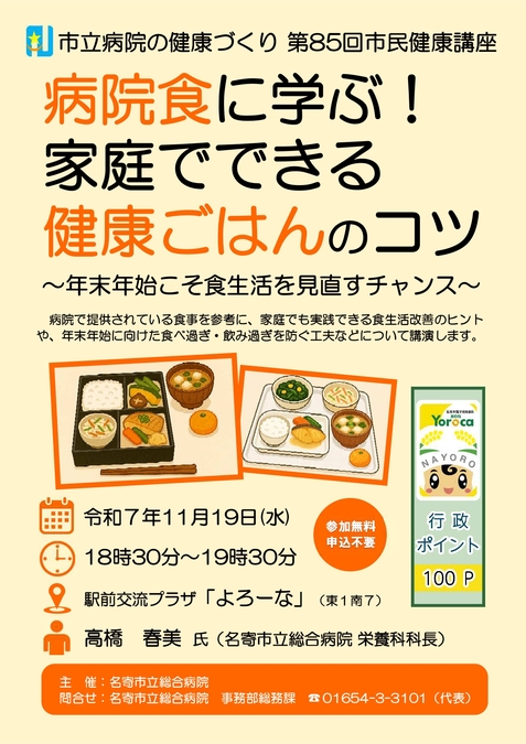 病院で提供されている食事を参考に、家庭でも実践できる食生活改善のヒントや、年末年始に向けた食べ過ぎ・飲み過ぎを防ぐ工夫などについて講演します。