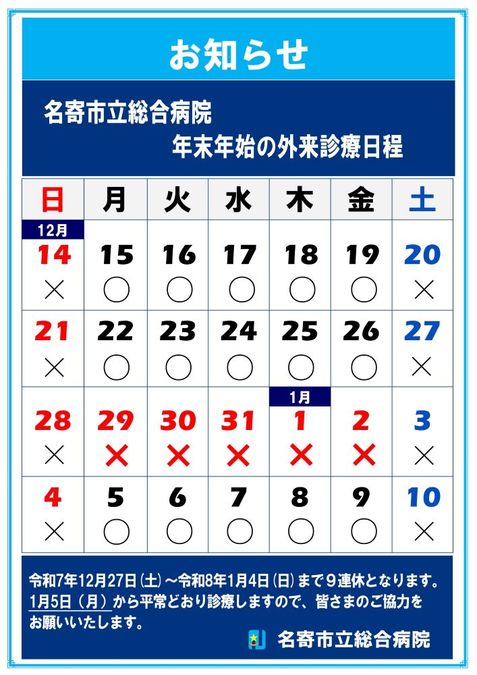 令和7年度 年末年始 外来診療日程のお知らせ このページでは次の情報をご案内しています。 一般外来について 一般外来について 下記の日程で年末年始の外来診療を休診いたします。ご協力のほどお願いいたします。 年末年始休診 : 12月27日(土)~ 1月4日(日) ダウンロードは こちら (326.7KB)から PDFファイルをご覧になるには、Adobe Readerが必要です。Adobe Readerをお持ちでない場合は、左の"Get Adobe Reader"アイコンをクリックしてください。 本文ここまで