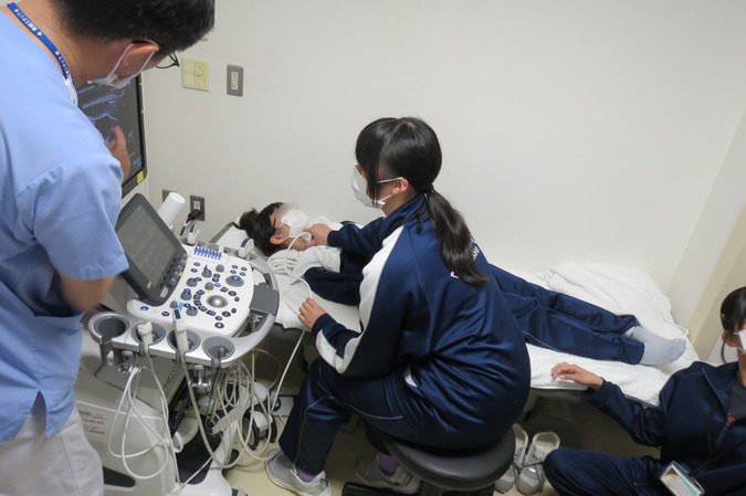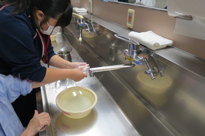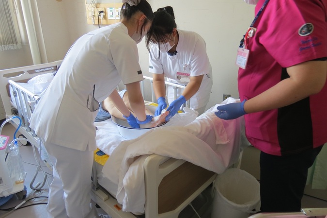 看護体験では、患者さんの話に耳を傾けたり、手浴を行ったりと、実際に患者さんにふれる貴重な体験もありました。