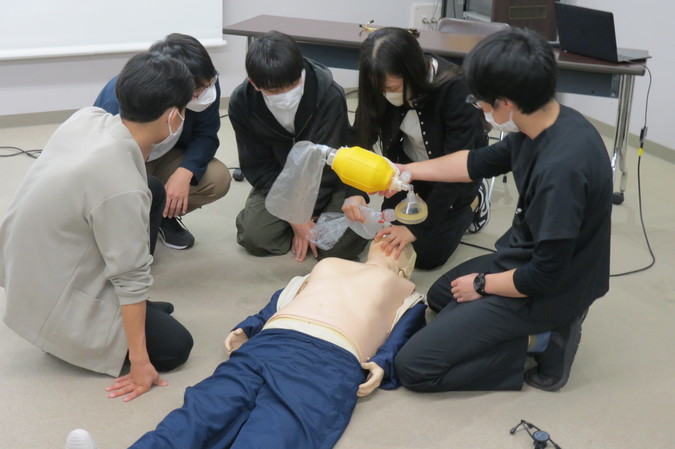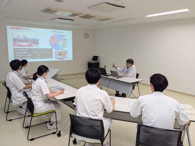 午前中は、事前課題として取り組んでいた「道北の地域医療について」のレポートを、生徒たちがグループごとに発表。その後、眞岸院長より、当院の役割や地域医療の現状について講義が行われました。午後からは救急科の医師による実技体験が行われ、心肺蘇生・人工呼吸のレクチャー、AEDの使用方法、エコーや聴診器の操作体験など、医療現場を身近に感じられるプログラムが展開されました。最後に研修医とのフリートークで体験談なども話し、医師を目指す生徒たちにとって、進路へのヒントや励ましとなる時間となりました。