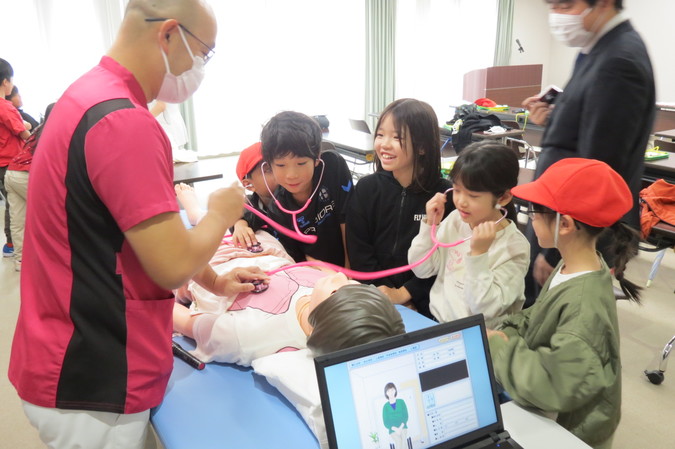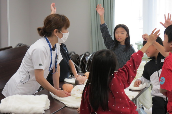 病院で働く職員へのインタビューや院内の探検、訓練用人形を使った赤ちゃんのオムツ交換など、さまざまな体験に積極的に取り組む姿が印象的でした。