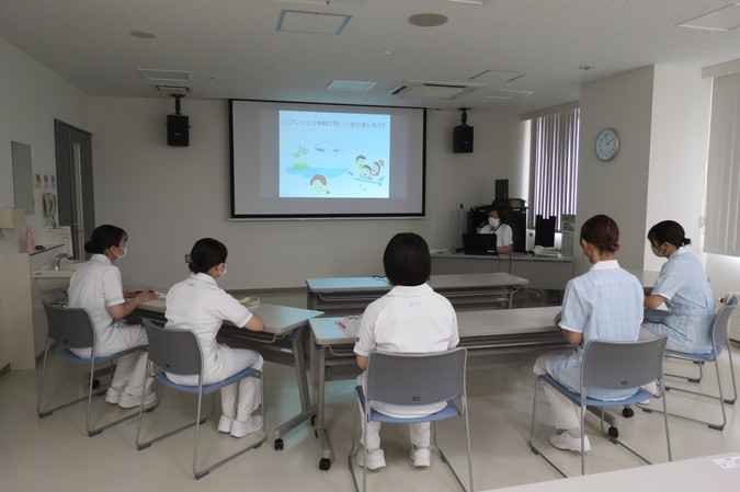 講演の最後には、患者さんから寄せられた感謝の言葉をまとめた動画を上映。看護のやりがいや、看護職を志した頃の初心を思い出す場面となり、涙を流す職員の姿も見られました。あらためて看護の原点に立ち返る機会となりました。