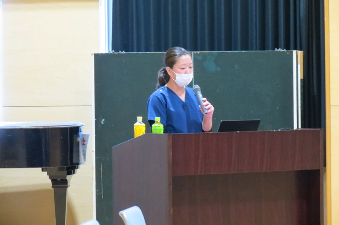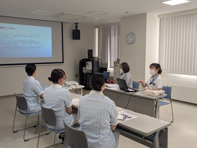 当日は、看護部長から看護部の概要説明、教育担当次長から研修・教育体制についての説明があり、1年目看護師の業務に密着した動画もご覧いただきました。