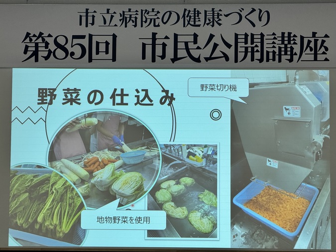講座では、院内厨房で病院食がどのように作られているかを写真や動画で紹介しました。さらに、名寄市民の健康統計をもとに健診の重要性を説明し、食事面から健康を考えることの大切さをお伝えしました。特に年末年始は飲食の機会が増えるため、食べる順番や飲酒量を工夫することが重要であるとお話ししました。