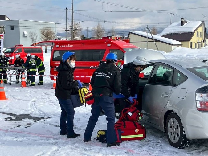 令和8年2月17日、名寄消防署が実施した多重衝突事故を想定した企画訓練に、当院からドクターカーおよびDMATが出動し参加しました。