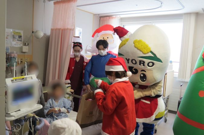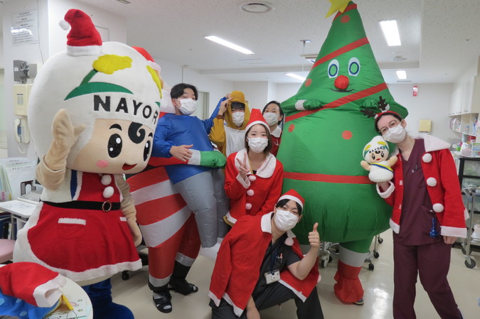 令和7年12月24日、名寄市観光キャラクター「なよろう」と、サンタクロースの衣装を着た当院の医師・看護師たちが、3階西病棟の病室を訪問しました。