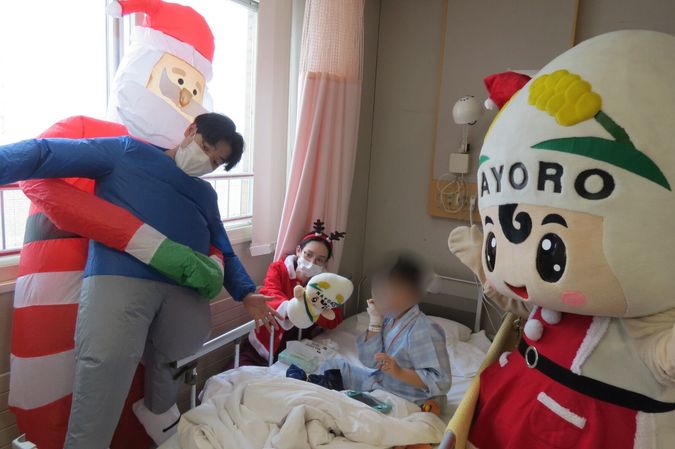 突然の登場に、驚いて泣いてしまう子もいましたが、しだいに笑顔が広がり、医師やスタッフも元気をもらえるひとときとなりました。