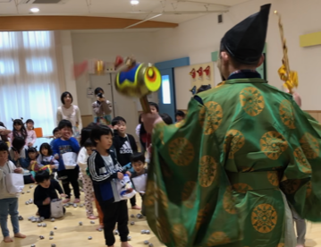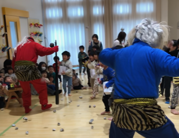 突然の鬼の登場に驚きながらも、「鬼は外!福は内!」と声をあげ、新聞紙で作った豆を投げて鬼を追い払いました。日本の伝統文化に触れ、元気な成長と健康を願う、温かい節分の1日となりました。