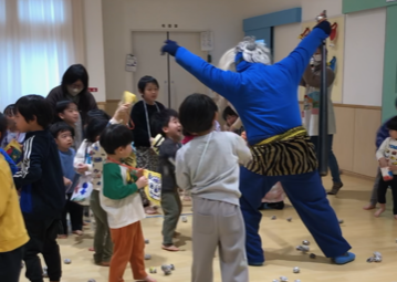 節分の2月3日、院内保育所つぼみ保育所に、名寄躍進会鬼追い祭りの鬼がやってきました。「節分行事を子どもたちに体験してもらいたい」と、病院サポートクラブから訪問を依頼していただき、今年も節分行事を楽しむことができました。