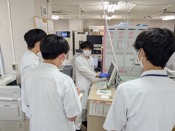 今回の部署見学では、薬剤部内(薬局)や特殊検査室、血管造影室、病棟などを訪問し、病院薬剤師がどのような業務を行っているのか、どんな雰囲気なのか実際の現場の様子を見学してもらいました。