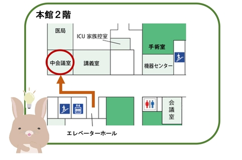 本館の2階に上がっていただき、エレベーターホールを背に左手に曲がって、右手にある会議室です。